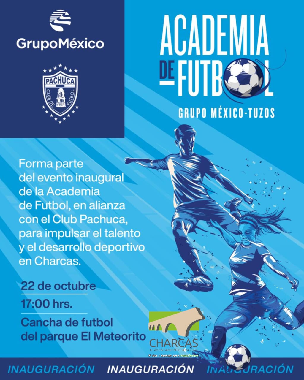 Con el respaldo del Ayuntamiento Municipal de Charcas, en colaboración con Grupo México y el Club de Fútbol Pachuca, mañana a las 17:00 horas, la cancha de fútbol del parque «El Meteorito», será el escenario de la gran inauguración de la Academia de Fútbol Grupo México-Tuzos.